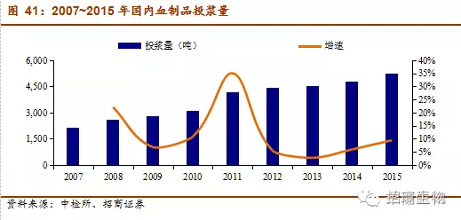 從漿量來看,國內的需求量在10000噸以上,我們測算,2015年國內采漿量~5800噸,投漿量約5200+噸同比增約10%,整體市場仍處于供不應求的局面。