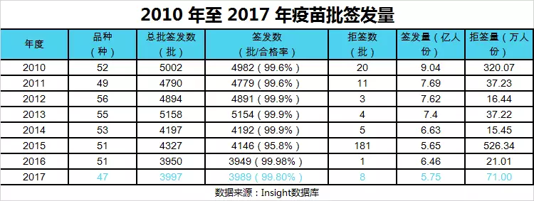 在中檢院和 7 家授權(quán)承擔(dān)生物制品批簽發(fā)的省級藥品檢驗機構(gòu)(北京、上海、廣東、四川、湖北、甘肅和吉林)推進下,2017 年,我國共簽發(fā)了 3997 批,共計 5.76 億份疫苗,涉及到 119 家企業(yè)的 47 個疫苗品種。