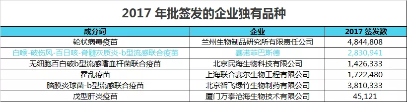 在今年新簽發(fā)的品種中,與五聯(lián)疫苗類似的獨家品種還有以下 5 個(占到今年簽發(fā)的 47 個品種的 10%),如蘭州生物的輪狀病毒疫苗、民海生物的無細胞百白破 b 型流感嗜血桿菌聯(lián)合疫苗。
