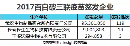 而今年百白破三聯(lián)疫苗簽發(fā)的為武漢生物制品研究所、長春長生生物科技有限責(zé)任公司和玉溪沃森生物技術(shù)有限公司 3 家公司,各企業(yè)簽發(fā)總量如下圖所示。