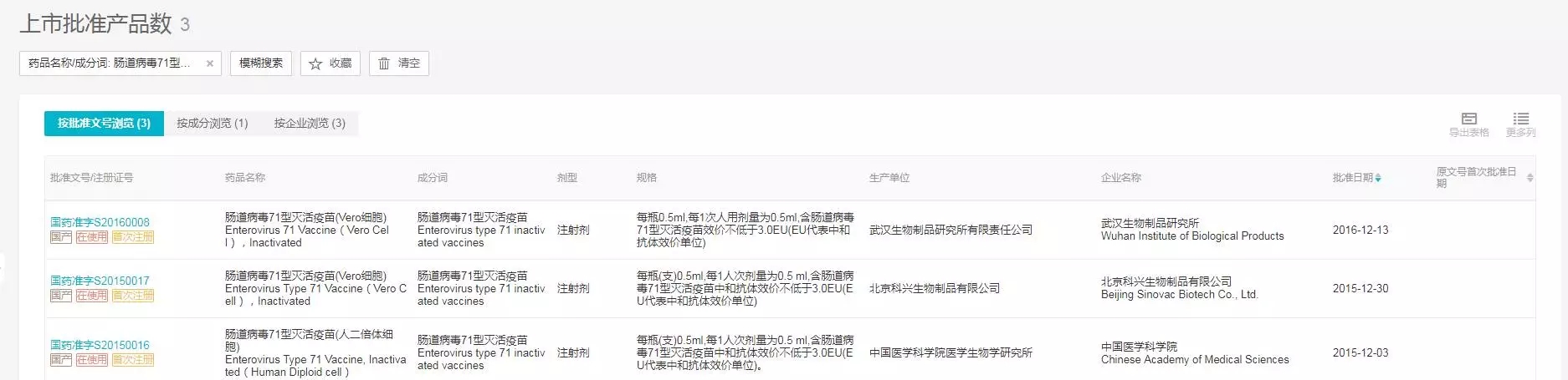 該疫苗適應(yīng)癥為腸道病毒 EV71 感染疾病。腸道病毒 71 型是人腸道病毒的一種,,常引起兒童手足口病、病毒性咽峽炎,重癥患兒可出現(xiàn)心肌炎、肺水腫、腦炎等。 目前批準(zhǔn)上市的企業(yè)有以下三家。